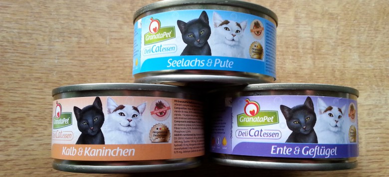 Die DeliCatessen Nassfutter-Sorten gibt es in Dosengrößen von 100g, 200g und 400g, wodurch man die Möglichkeit hat immer die passende Menge frisch geöffnet verfüttern zu können – egal ob Einzelkatze oder mehrere. Man hat also nicht mehr ständig eine angefangene Dose herumstehen, was ja gerade im Sommer sehr unappetitlich ist. Die GranataPet DeliCatessen gibt es in einer großen Sortenauswahl. Außer den drei von uns getesteten gibt es noch: Lamm & Truthahn, Seelachs & Meeresfrüchte, Lamm & Kalb, Rotbarsch & Huhn, Huhn & Shrimps, Wild & Ente, Truthahn & Fasan, Kalb & Geflügel und Weißfisch & Wildleberragout.